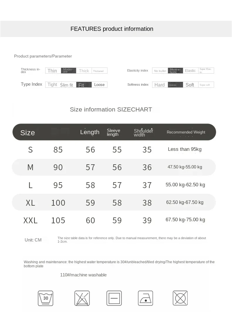 XL: Chest circumference of 100 centimeters, length of 60 centimeters, sleeve length of 59 centimeters