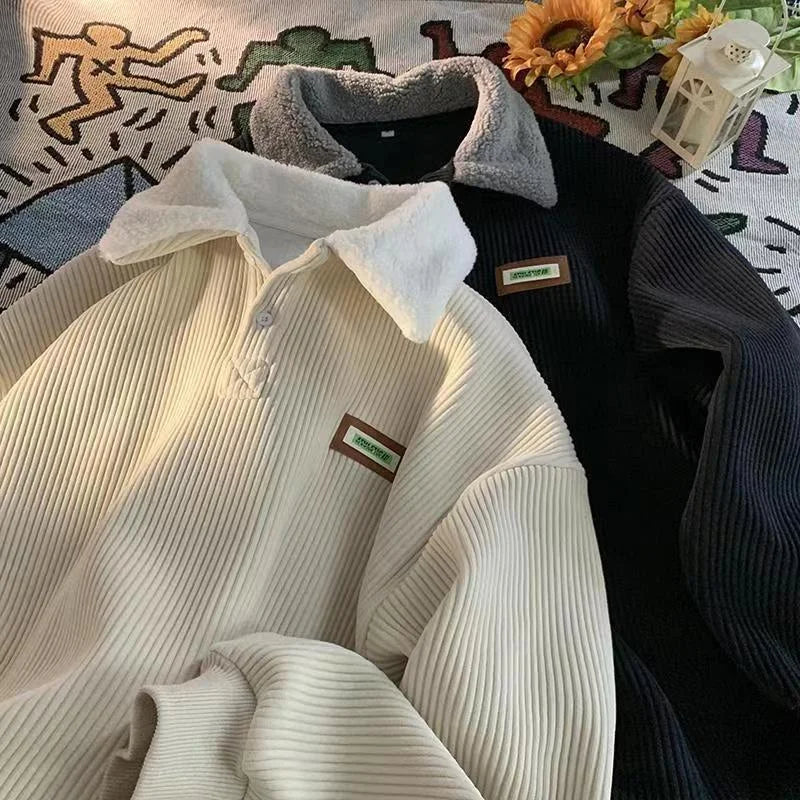 2024 Corduroy Polo Collar Sweater - Thickened Lambwool Pullover for Couples - Loose and Comfortable Casual Wear for Autumn and W