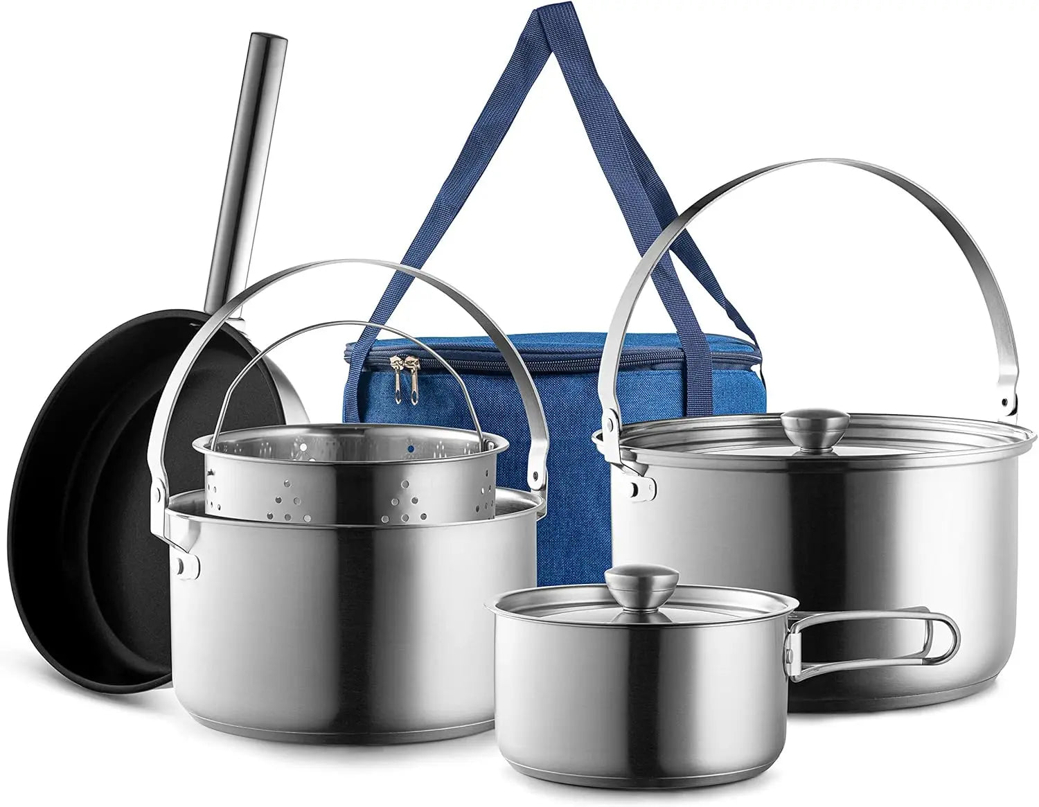 Camping Cookware 304 stainless steel 8-piece pot and pan Cooking kit | Skillet steamer with travel tote bag
