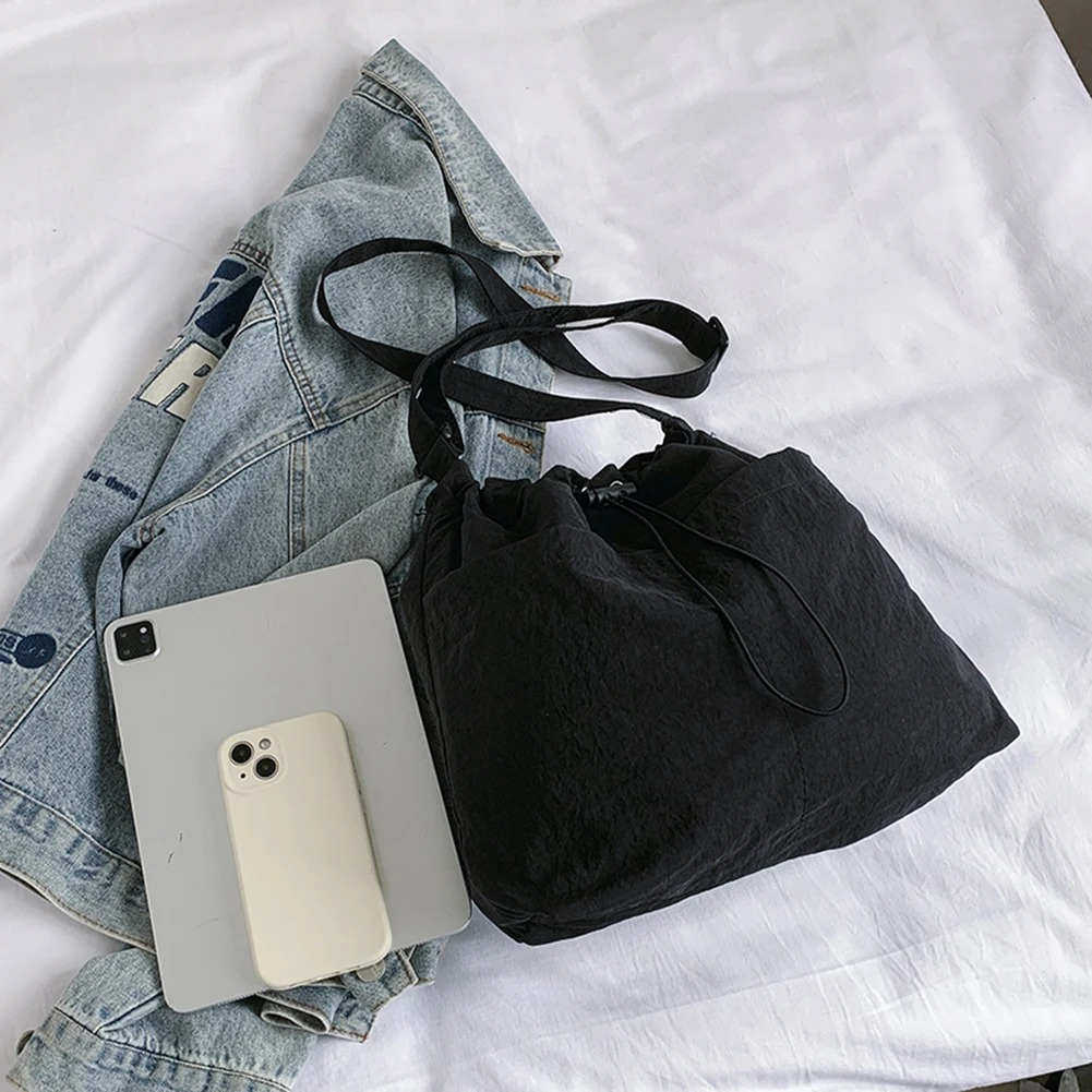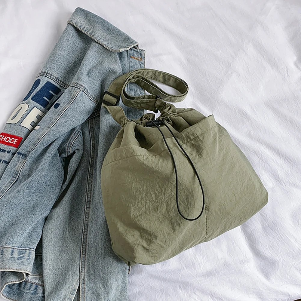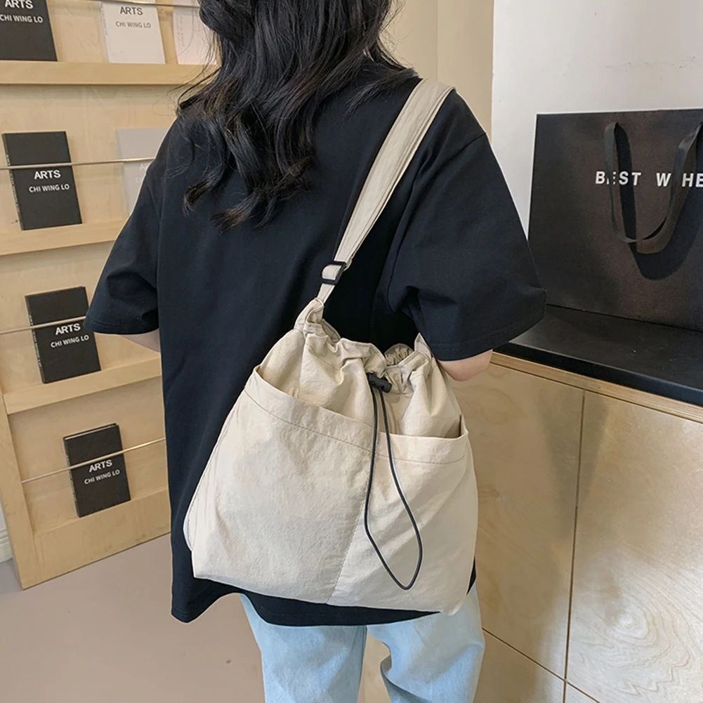 Women Casual Satchel Bag Adjustable Strap Nylon Drawstring Bucket Bag Lightweight Commuting Bag Multi-pockets for Outdoor Travel