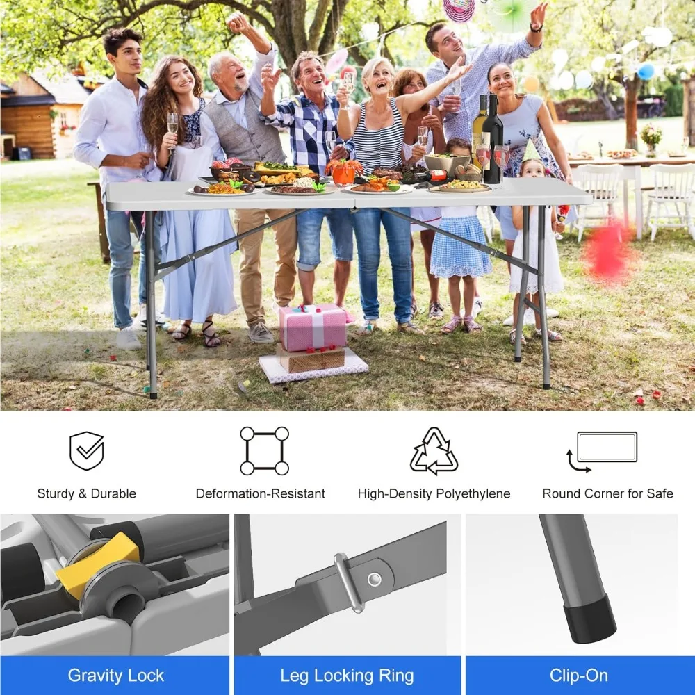 Foldable Table 6ft, Plastic Folding Table, Portable Heavy Duty Dining Table with Lock Function & Carrying Handle, Outdoor Indoor
