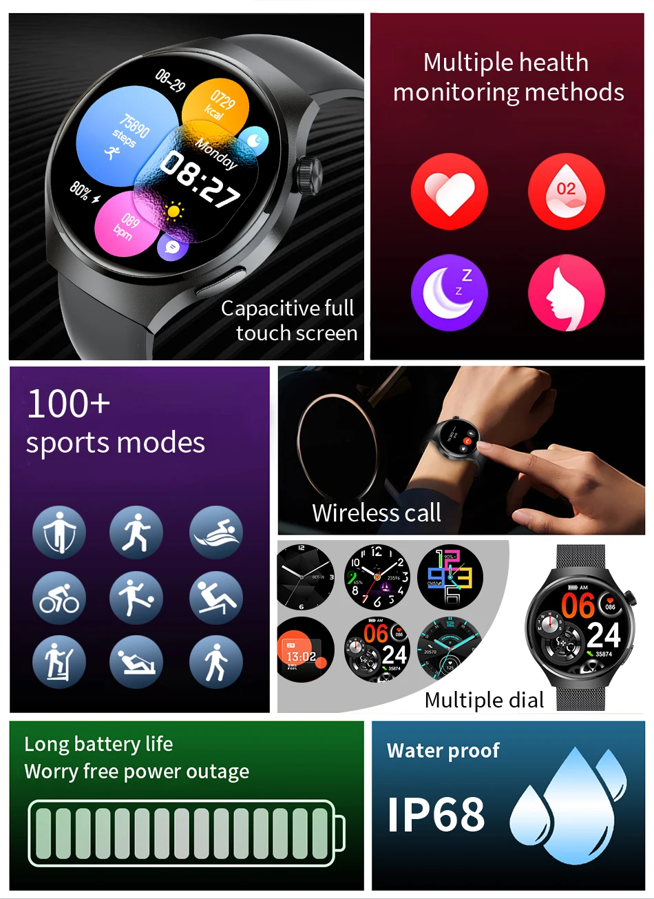 Smartwatch Features: 100+ sports modes,Voice assistant,With encoder,Bluetooth call,Heart rate monitoring,incoming call