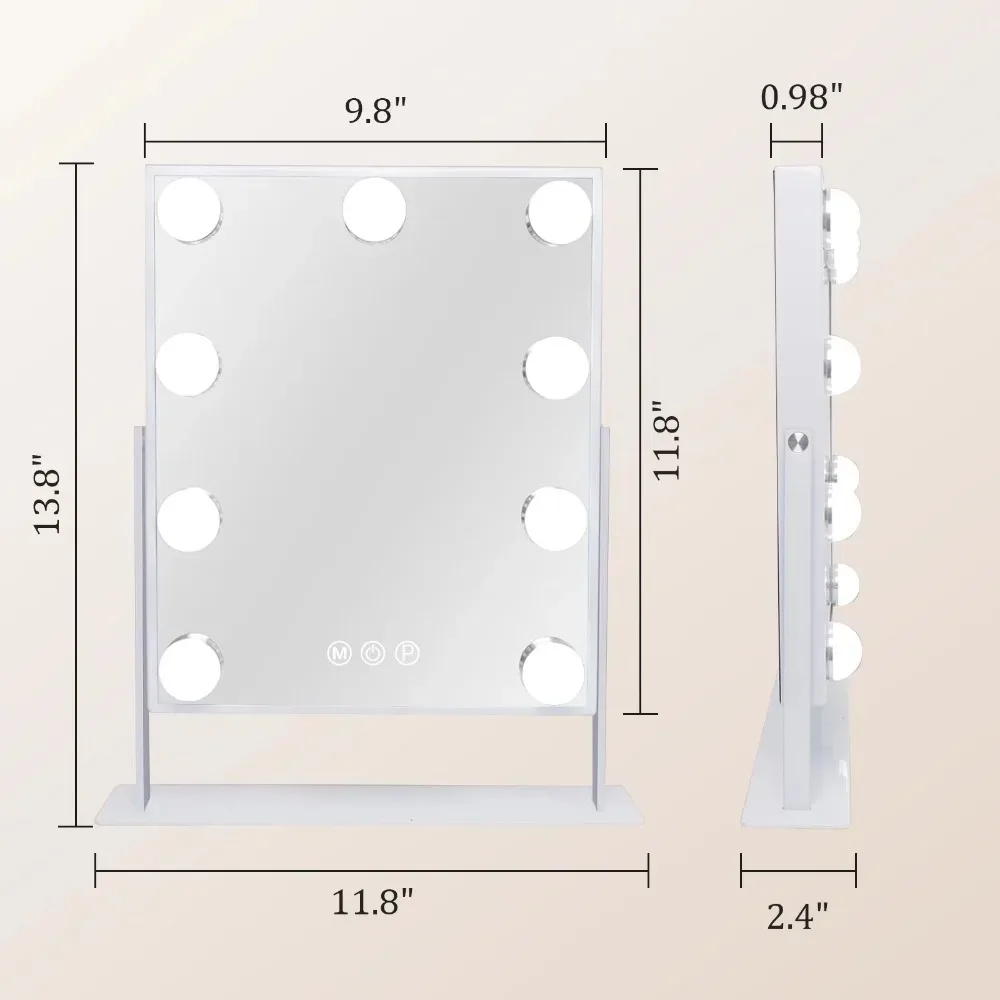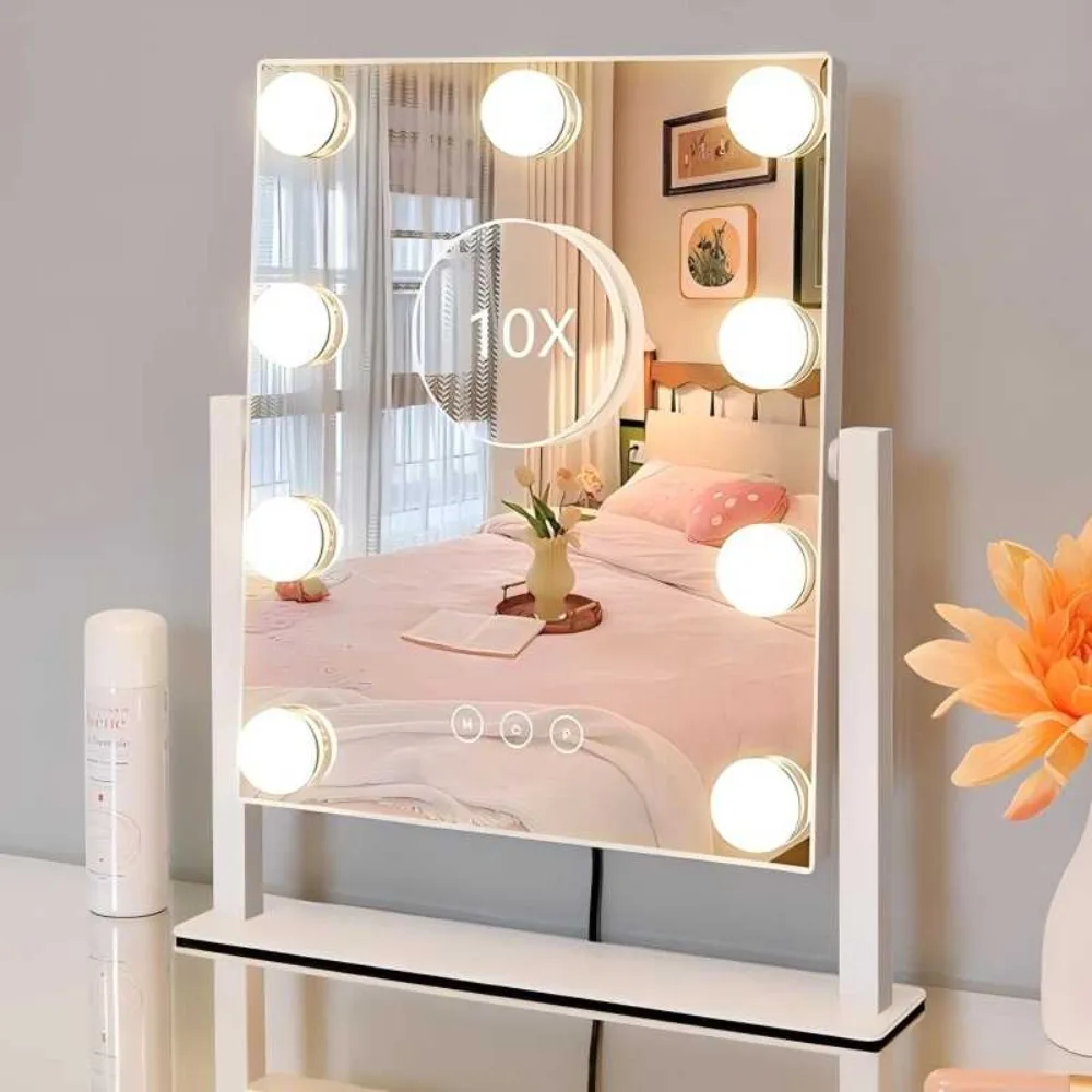Vanity mirror with lights has 9 pcs LED bulbs which is a perfect for some small/ medium size dressing table. This makeup mirror shows enough lights when you makeup. It including warm yellow, daylight and cool white 3 different lights and the brightness is adjustable. Detachable 10X Magnification of the mirror with lights helps you to see every detail clearly and can free 360-degree rotation and be fixed at any angel to give you the perfect viewing angle. Our Hollywood makeup mirror with lights is perfect for makeup application at any setting like bedroom, dormitory, professional dressing room.