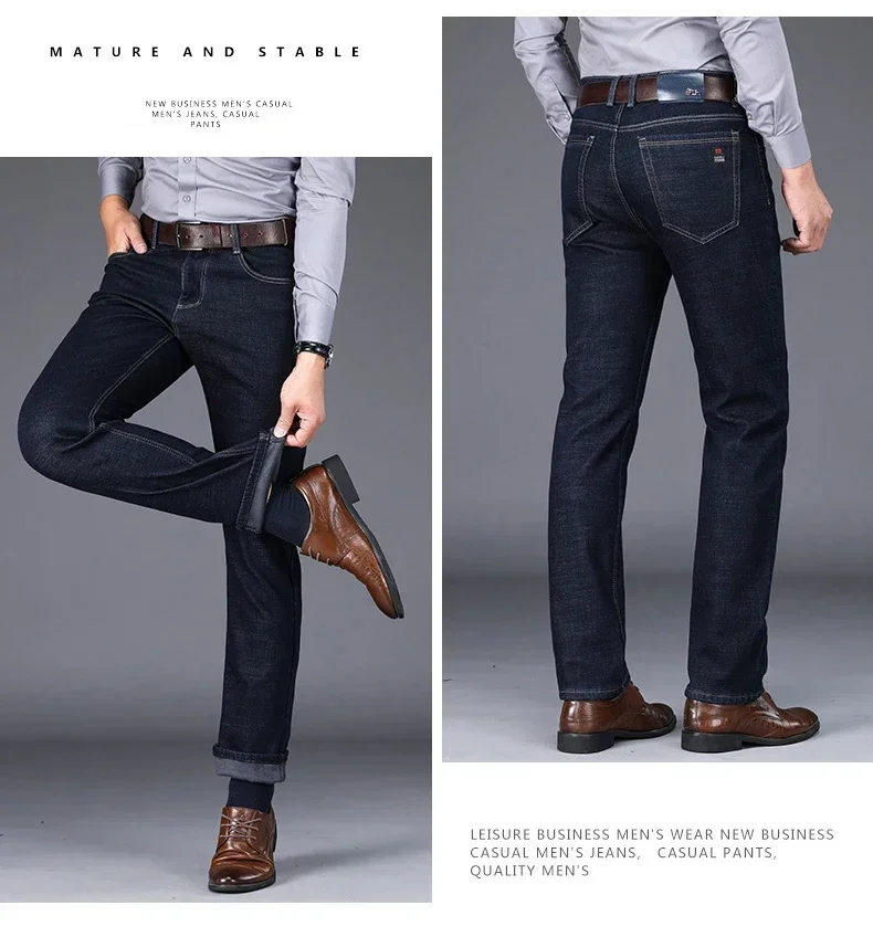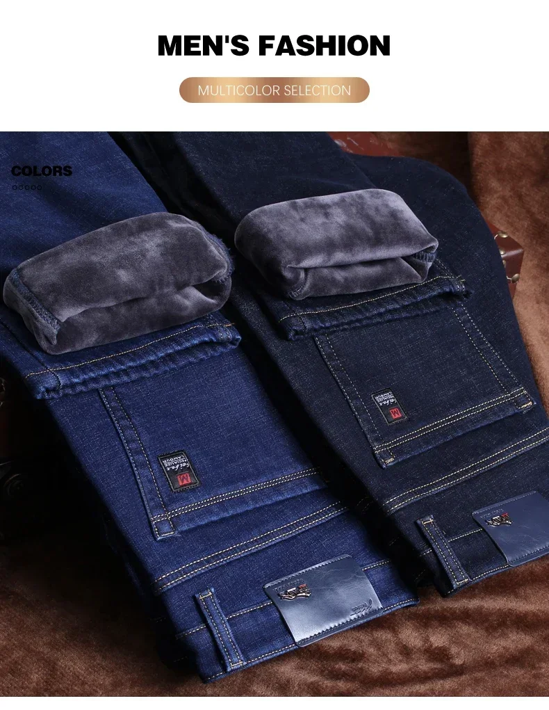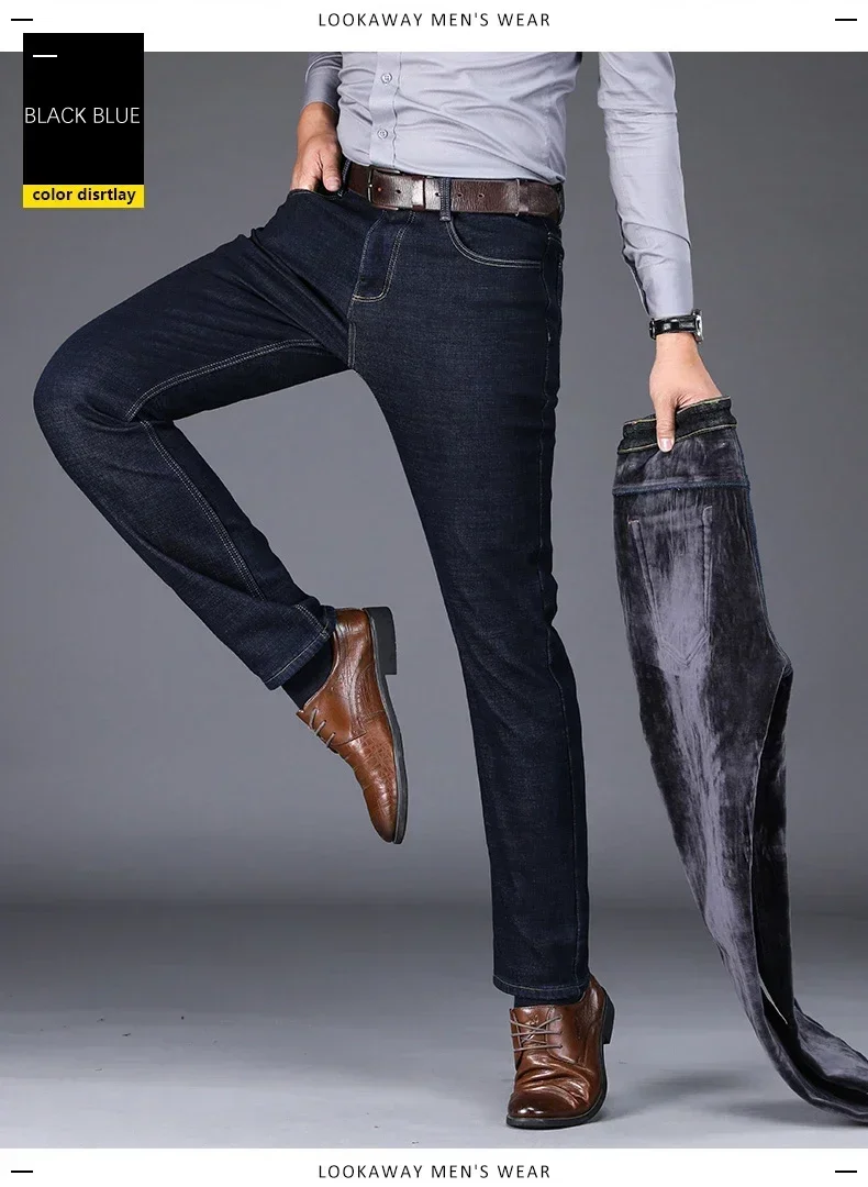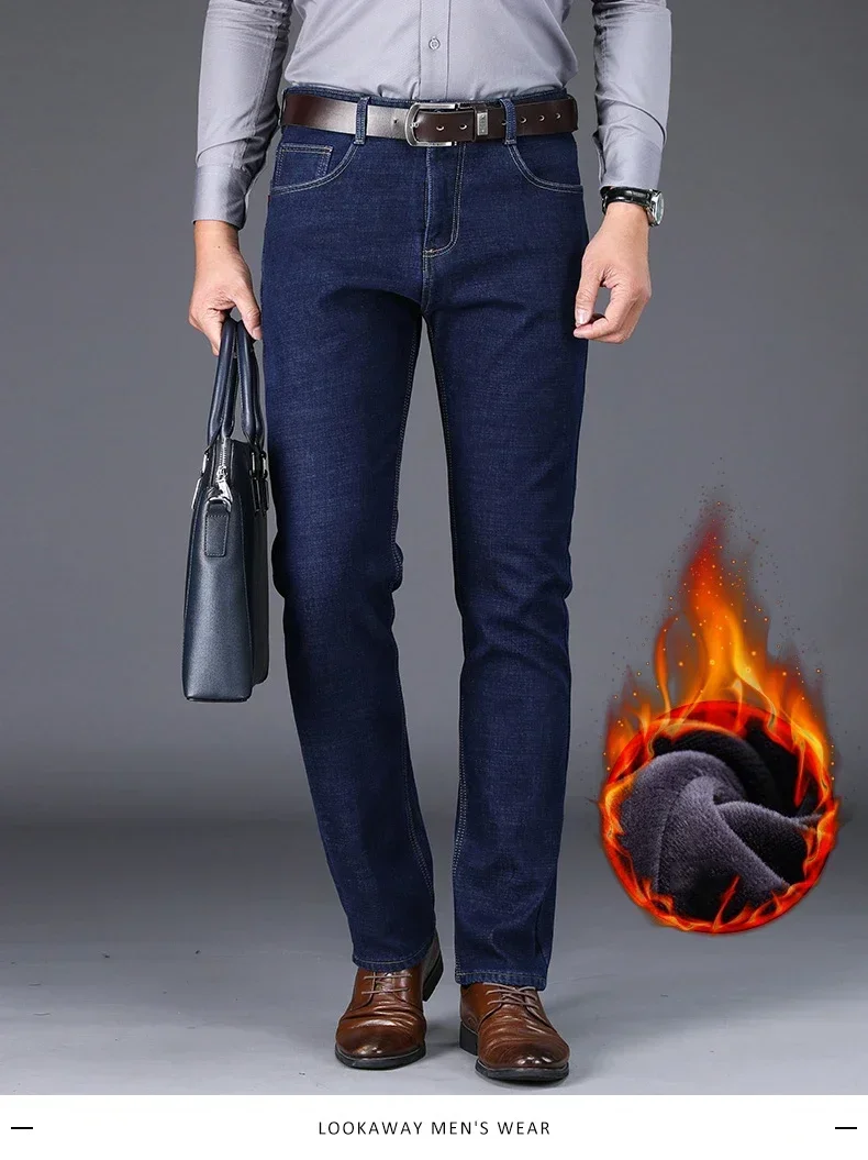 New Men's Fleece Warm Jeans Winter Thicken Plush Velvet Business Office Denim Trousers Brand Clothing Stretch Casual Male Pants
