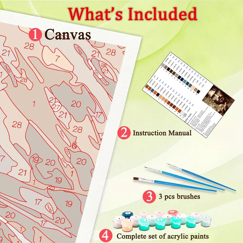 ☀Paint by Number Kits : This paint-by-number kits include all the tools needed for painting, canvas*1, 3 brushes, paint, instruction manual*1