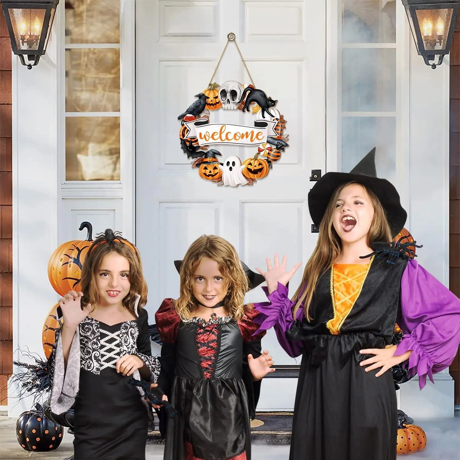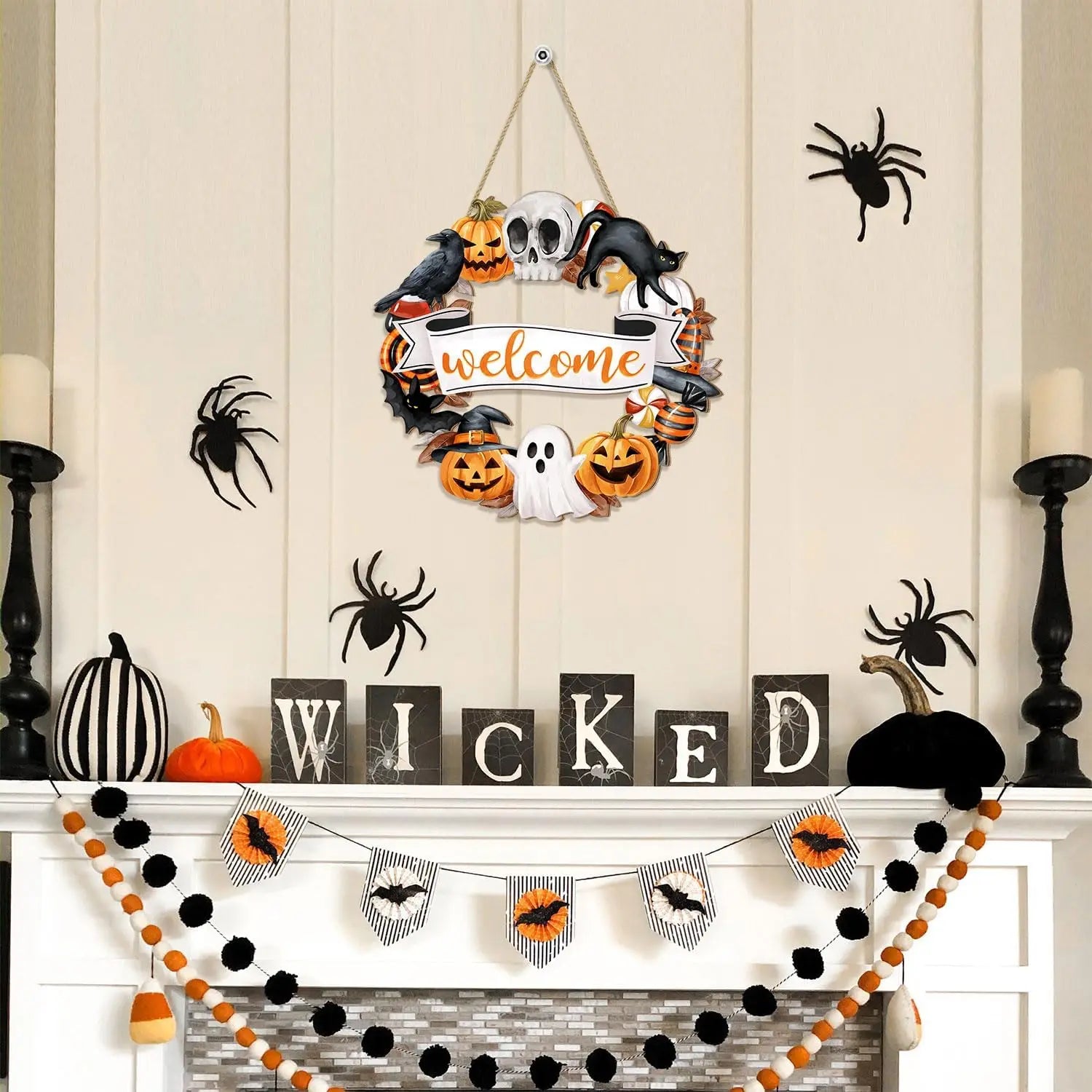 Rustic Halloween Wooden Wreath – Ghost, Cat, Pumpkin & Skull Door Sign for Front Door & Home Decor