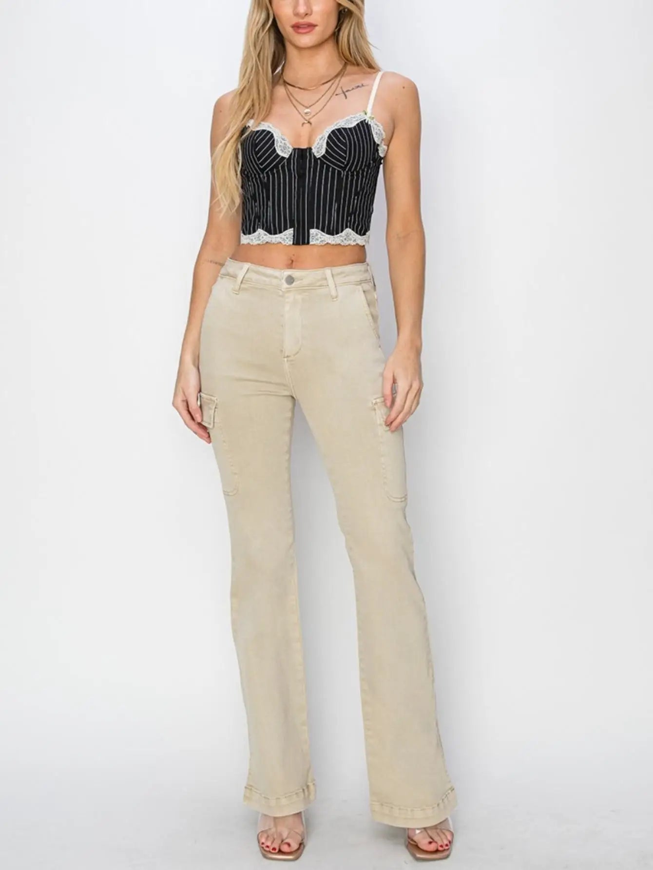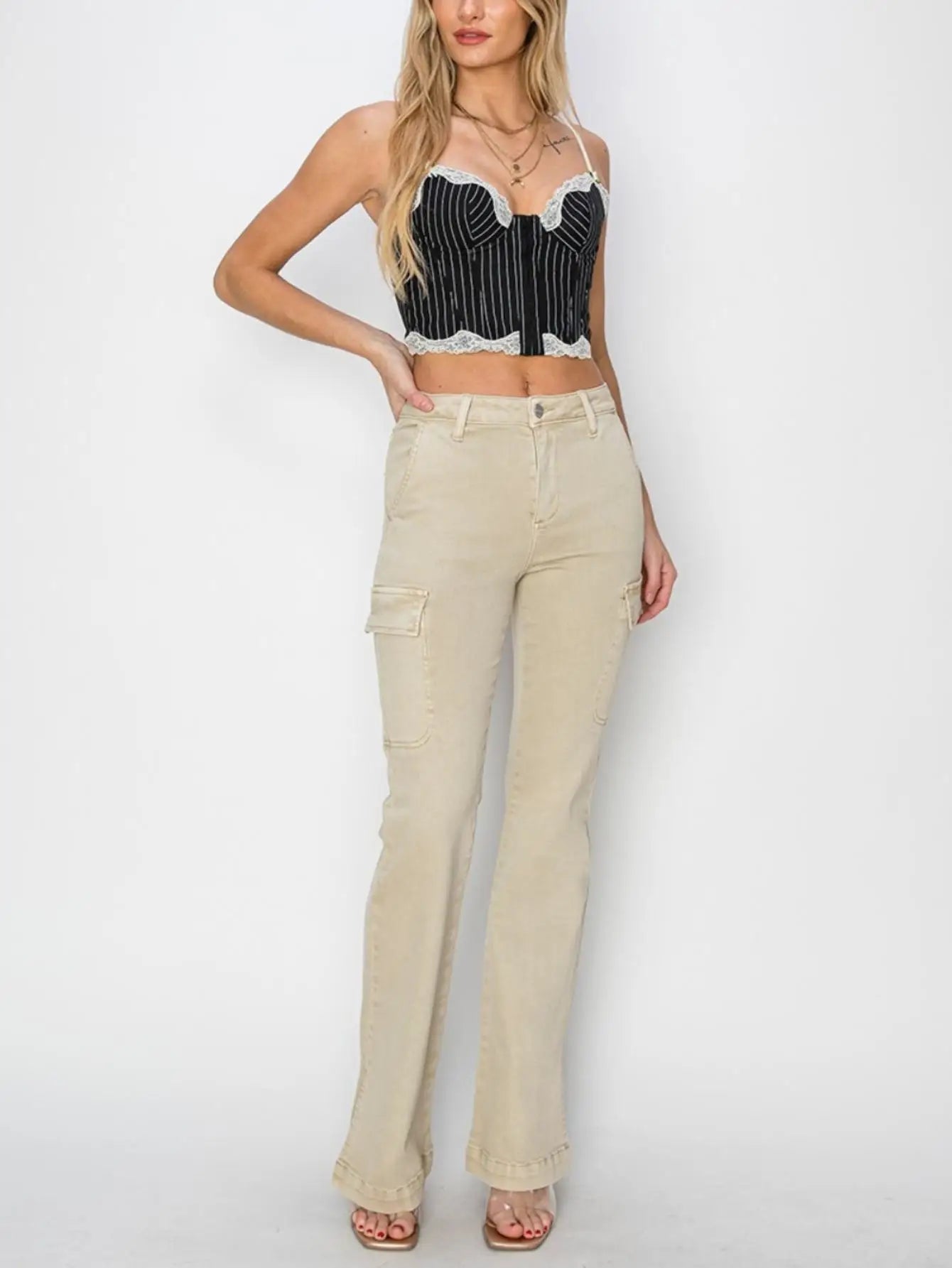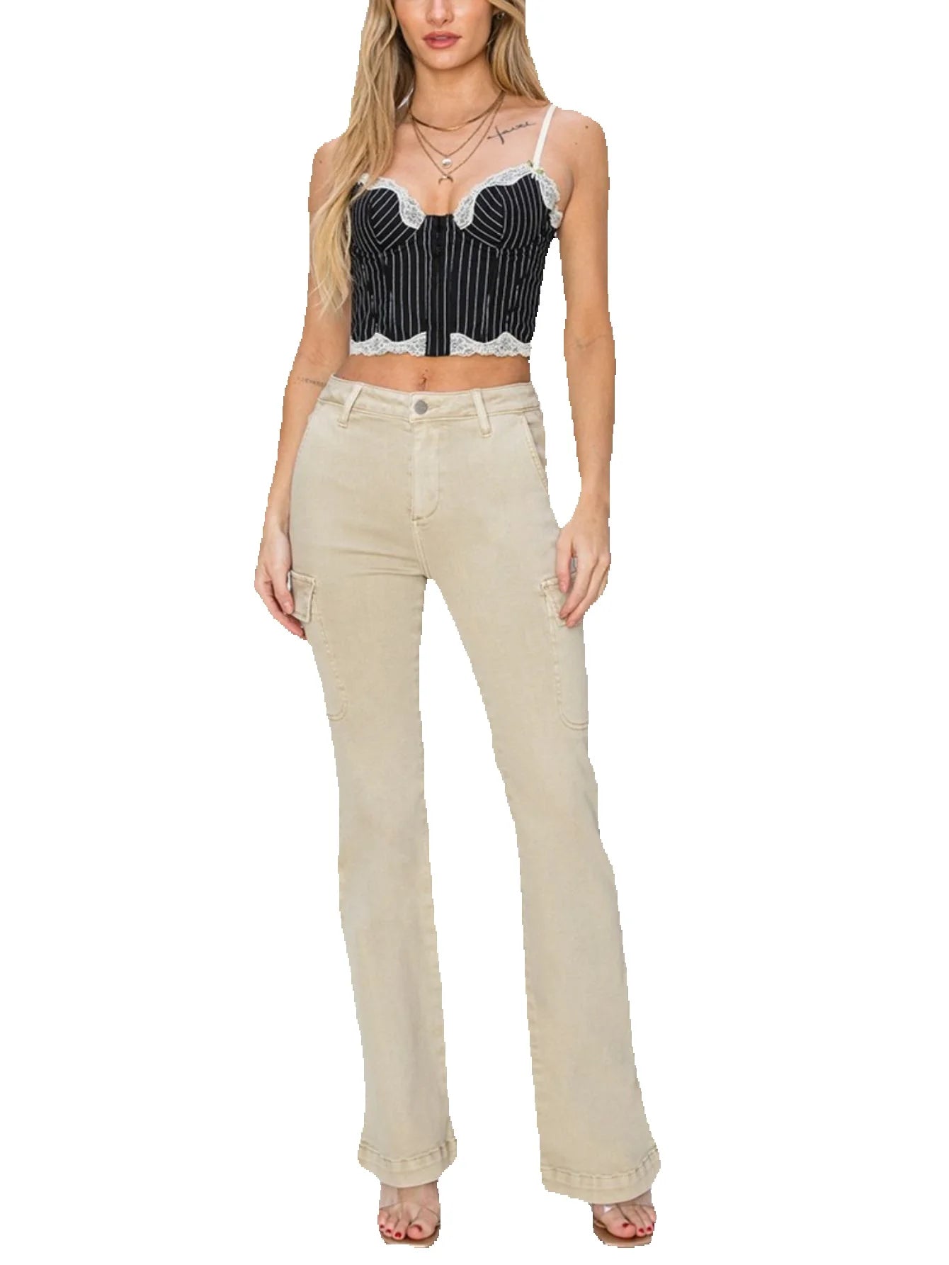 Women’s Casual Cargo Jeans Chic High-Waisted Side Slit Beige Cargo Boot Cut Denim Pants Utility Pockets, Stretch Denim Casual