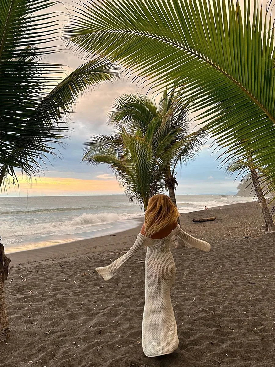 Women s Long Fit Dress Long Sleeve V Neck Tie Up Knitted Crochet Beach Dresses