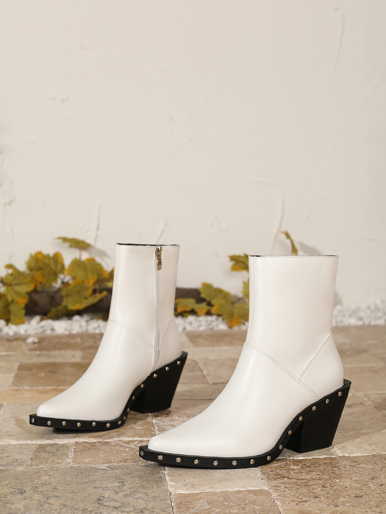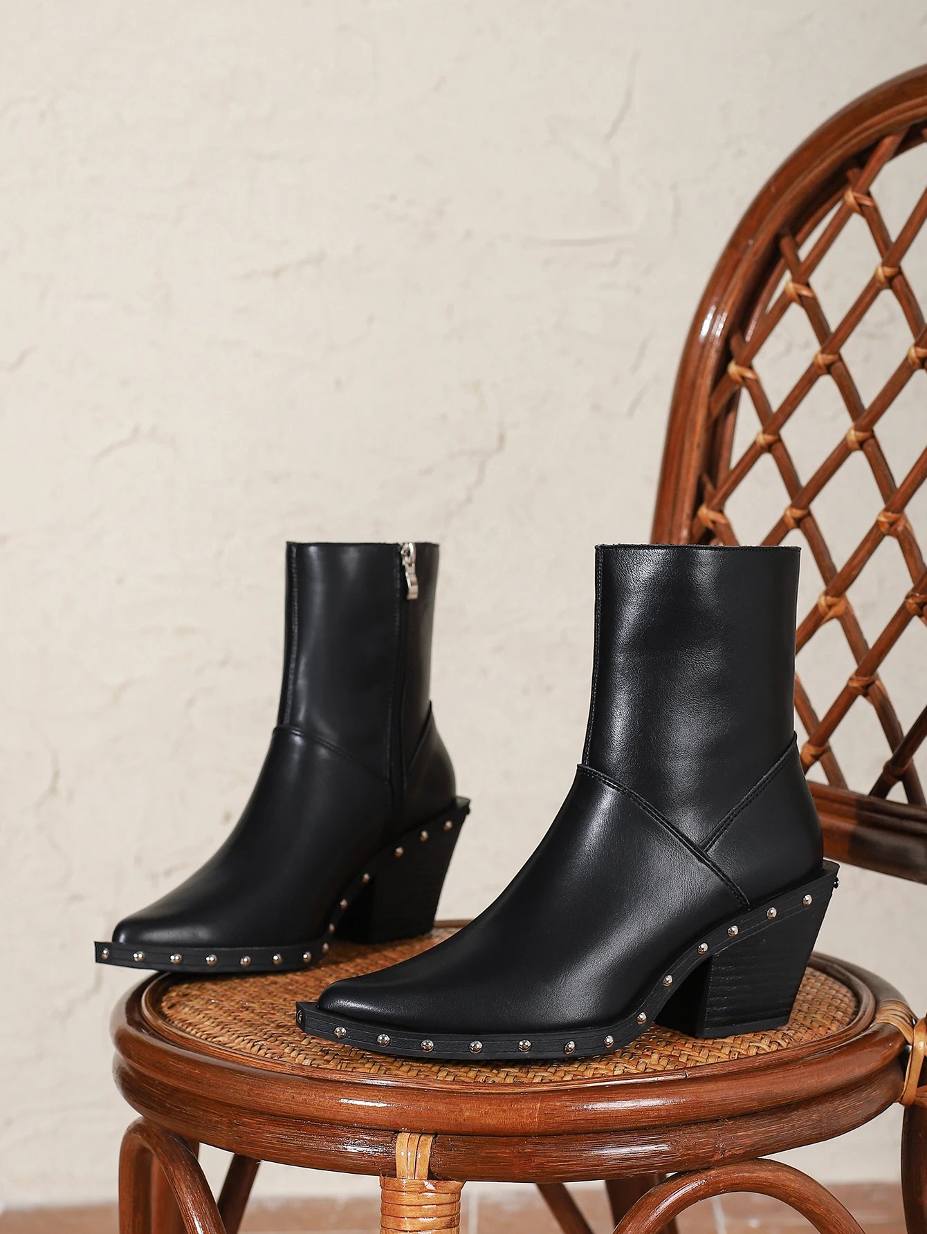 Women's Studded Short Gogo Boots Pointed Toe Chunky High Heel Stretch Ankle Boots